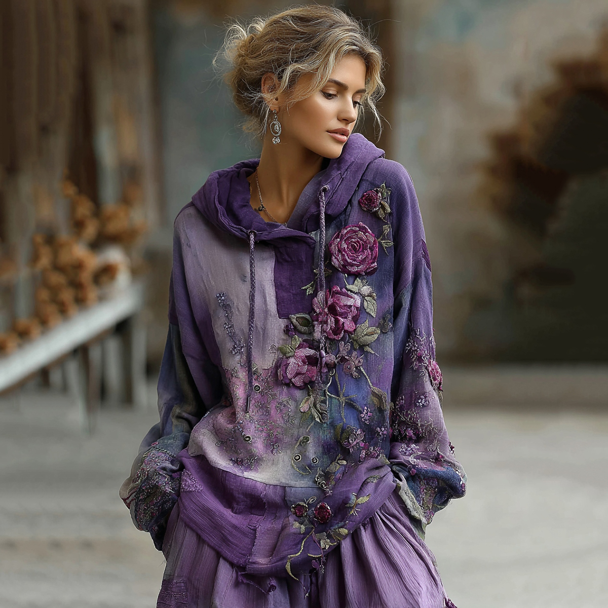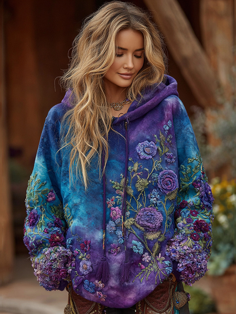 Women's Vintage Purple And Blue Lavender Patchwork And Floral Embroidered Art Gradient Comfort Hoodie