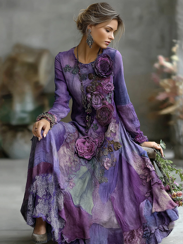 Women's Vintage Purple Rose Art Pattern Gradient Long Sleeve Dress
