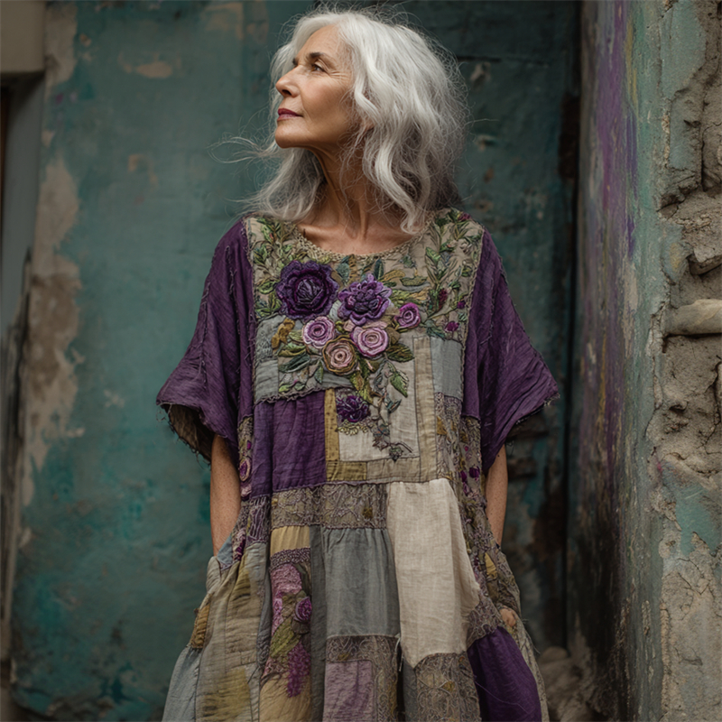 Vintage Cottagecore Purple Roses Embroidered Patchwork Linen Dress