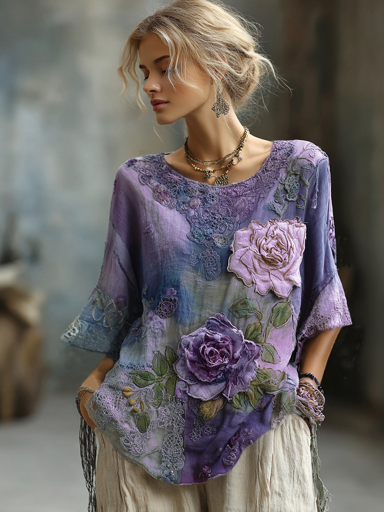 Vintage Purple Patchwork Rose Art Round Neck Loose T-shirt