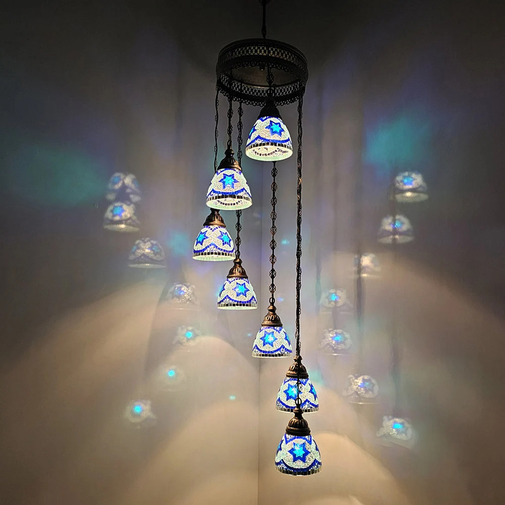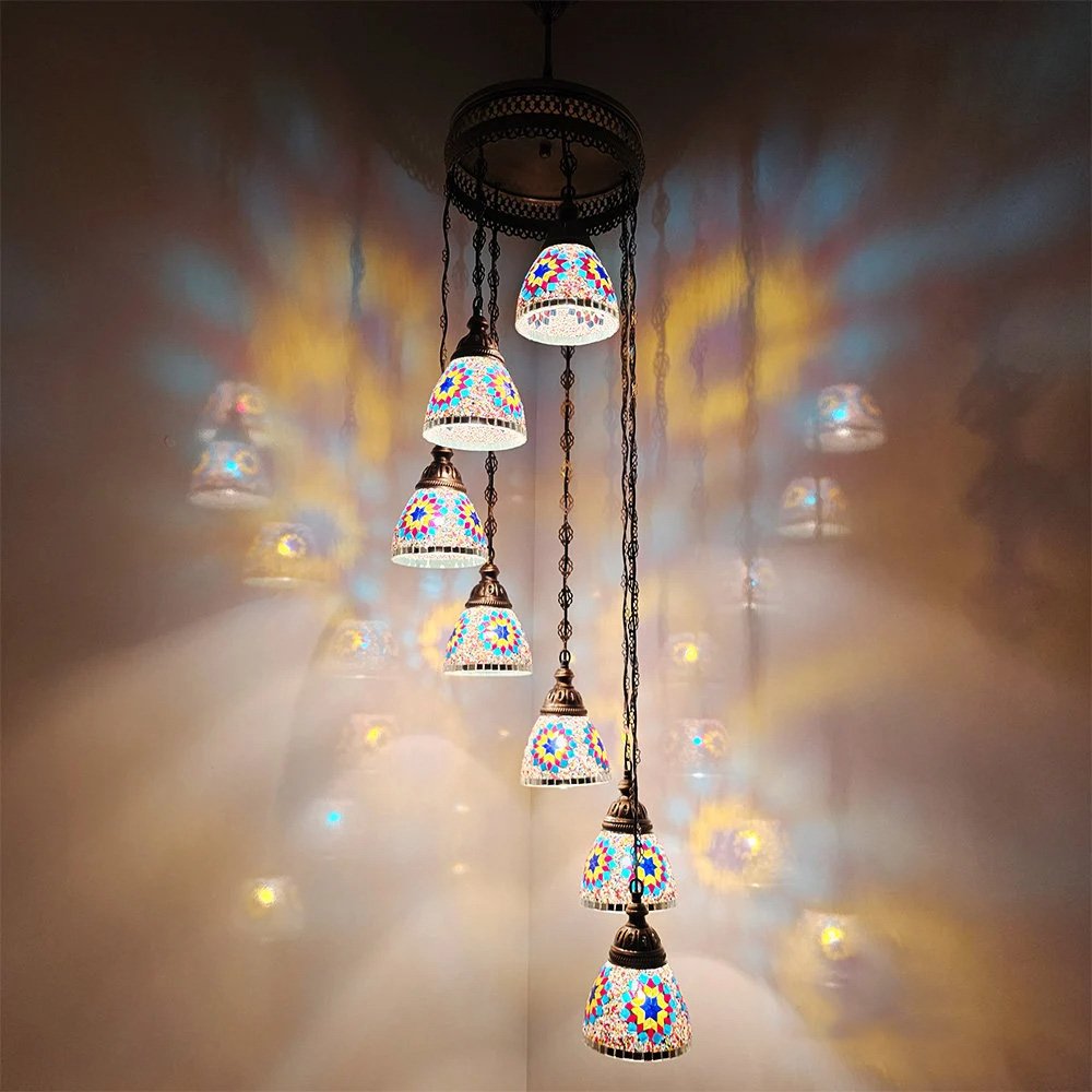 7 Funnel Glass Spiral Turkish Mosaic Chandelier, Moroccan Hanging Ceiling Lantern Lamp Pendant Light Fixture Lighting Chandelier, Restaurant.