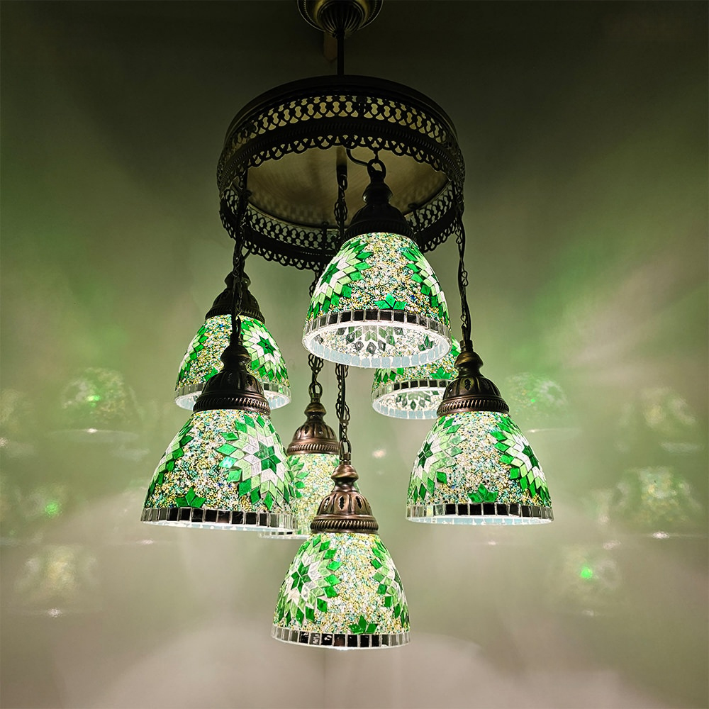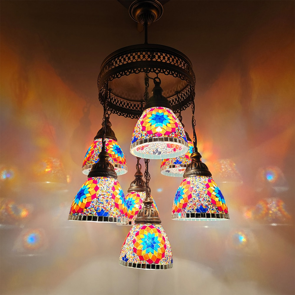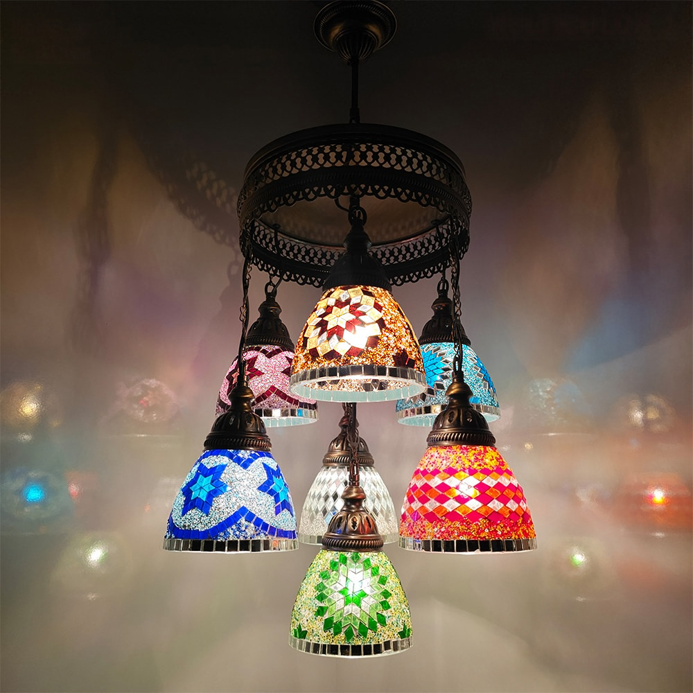 7 Funnel Sphere Mosaic Chandelier, Turkish Handmade Mixed Globe Lamps, Living Room, Bedroom, Cafe, Kitchen Dining Lamps, Restaturant Lights.