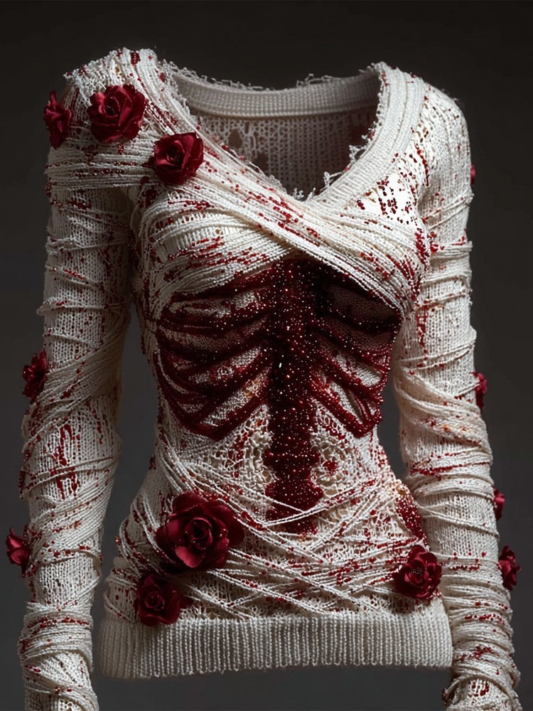 Elegant Skeleton Bloody Roses Bandages V Neck Sweater