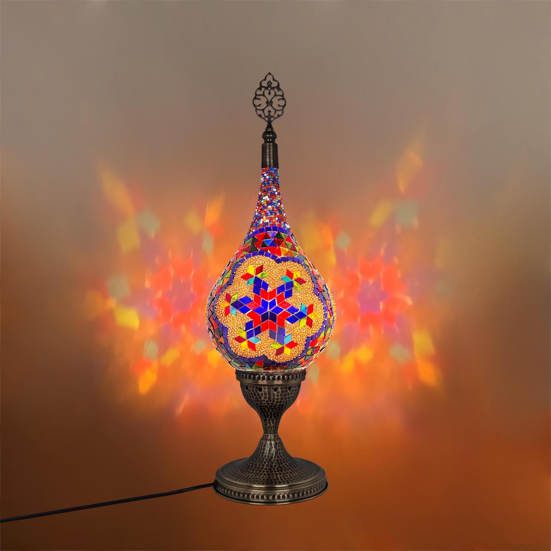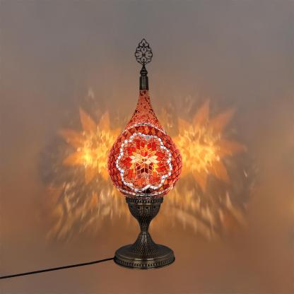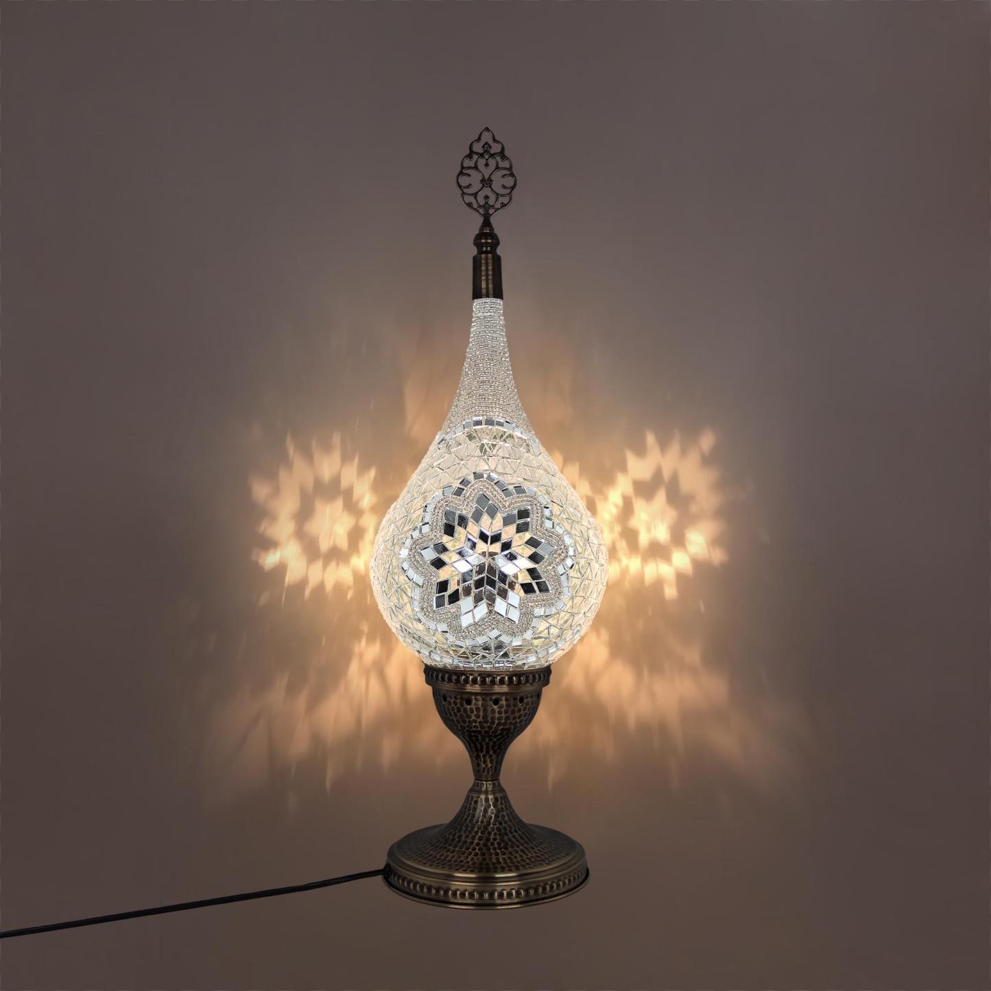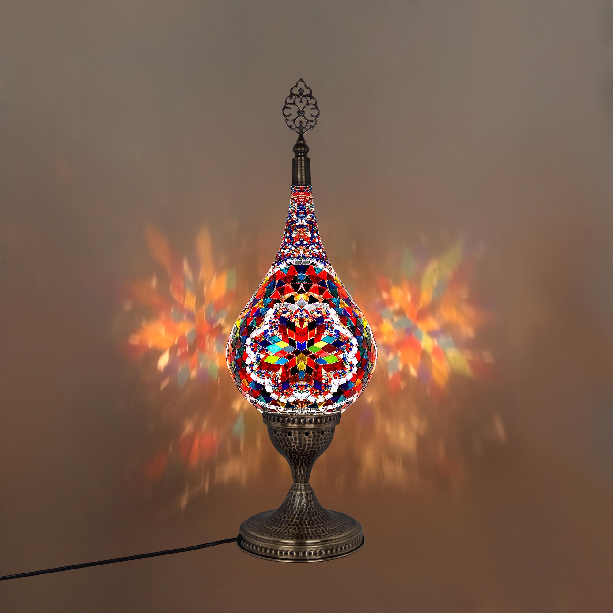 Illuminate your space with the enchanting glow of this large drop-shaped Turkish mosaic lamp. Perfect for bedside tables, this handcrafted lamp features intricate glass bead mosaics in vibrant colors, creating a warm and inviting ambiance.
