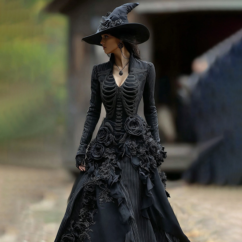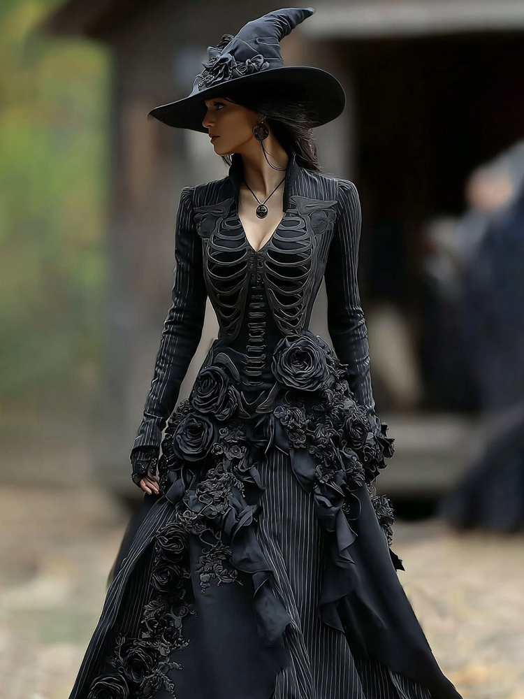 Halloween Vintage Skull And Rose Gothic Witch Maxi Dress