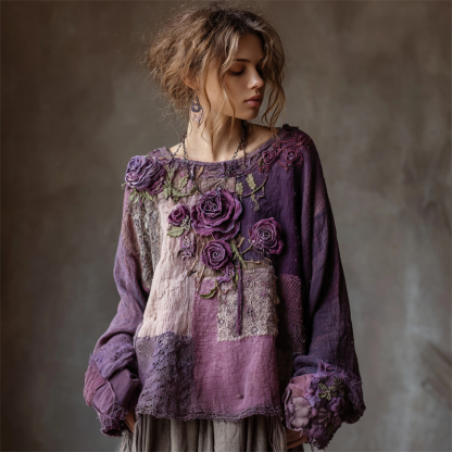 Vintage Purple Roses Boho Lace Patchwork Linen Tunic
