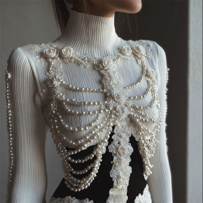 Vintage White Roses Skeleton Pearls Lace Contrast Turtleneck Sweater