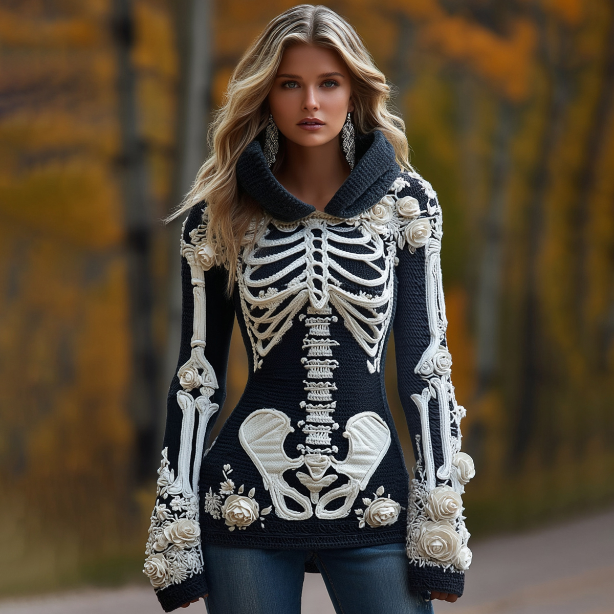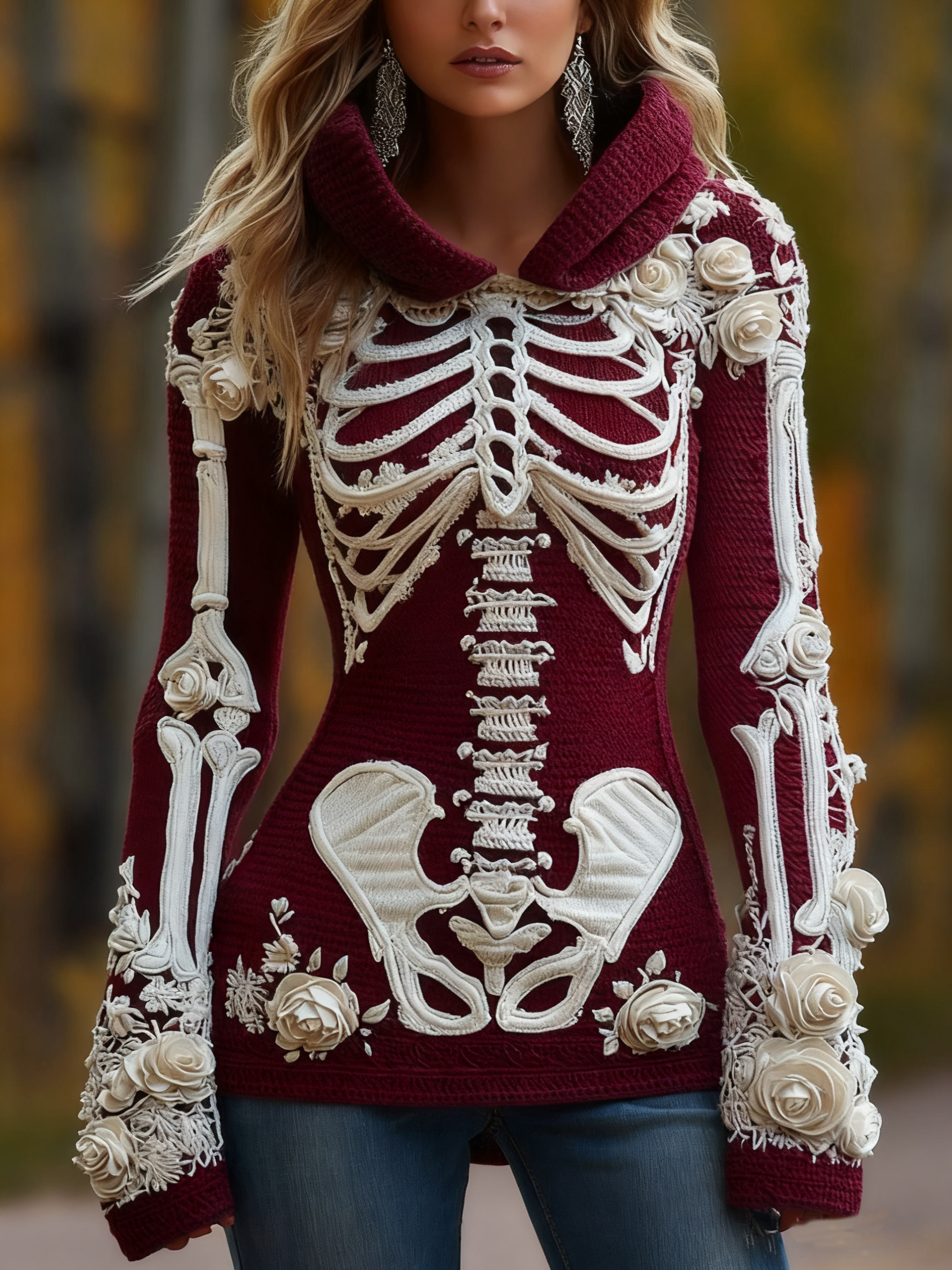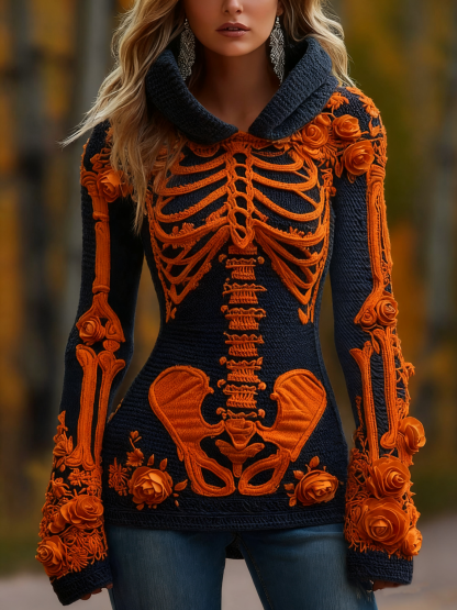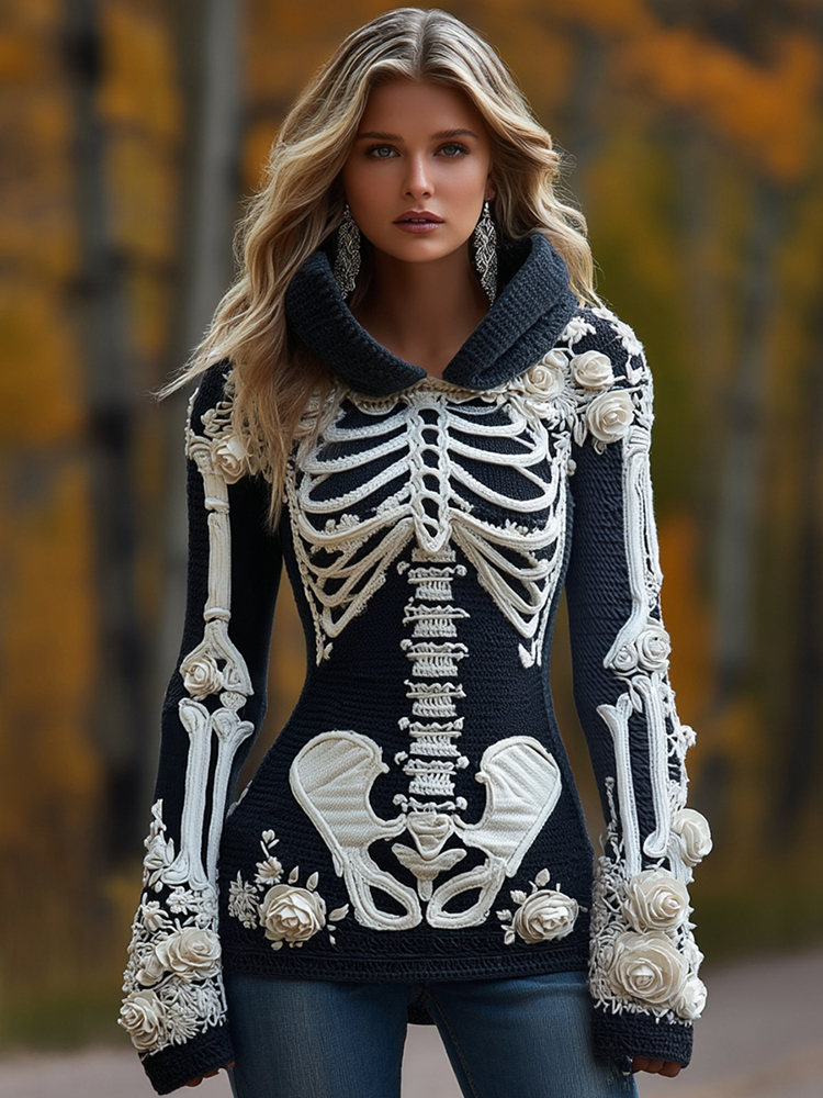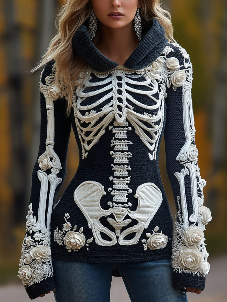 Women's Halloween Skeleton Bones With Roses Art Knitted Warm Hooded Sweater