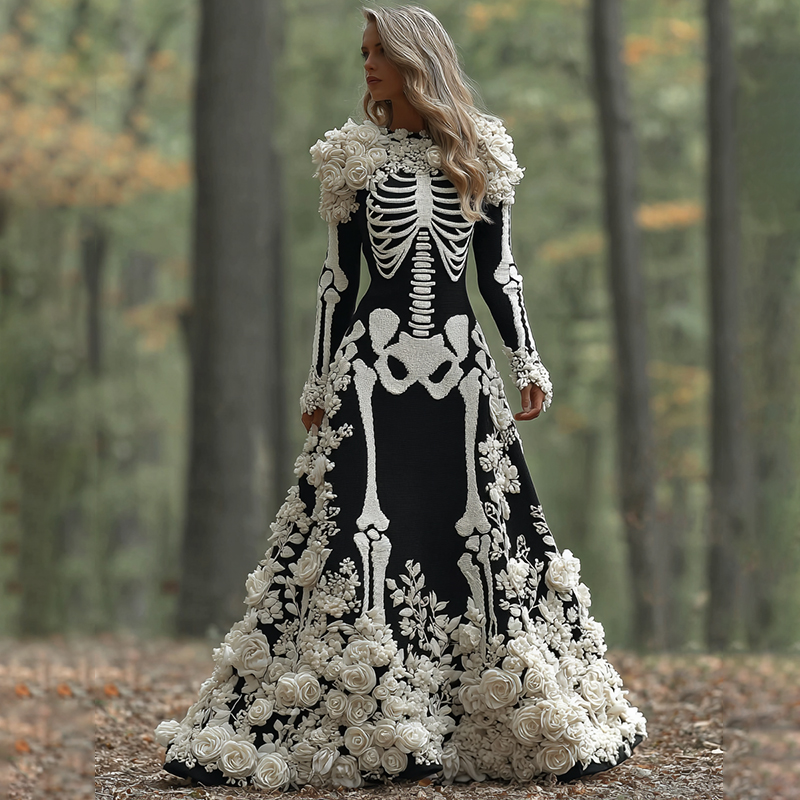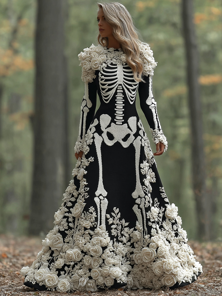 Women's Vintage Halloween Skeleton Bones With Rose Art Cozy Knitted Warm Long Sleeve Maxi Dress