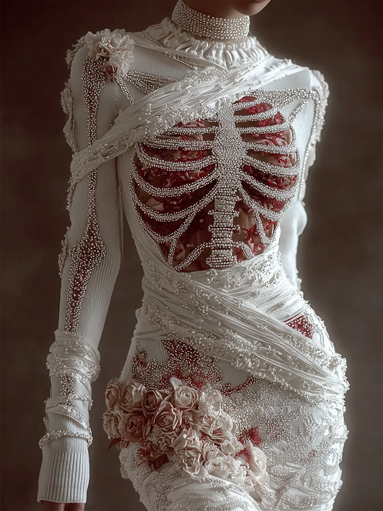 Women's Vintage Skeleton Bones With Rose Cozy Knit Mini Sweater Dress
